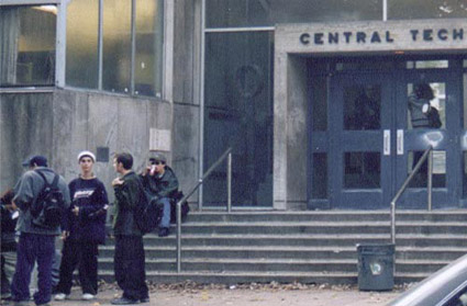 This 7-channel video entitled Hiccup is based on a 30 day performance that took place daily between 8:45 am & 9:00 am at Central Tech High School in downtown Toronto. Conceived as an orchestrated "ballet of the ordinary", the work pivots on the play of two differentiated timelines: my standardized routine of carefully choreographed body movements, juxtaposed against the limitless variables of the everyday world.