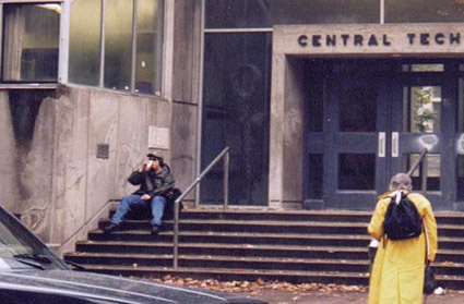 Everyday for one month I arrived at the front of the school at the exact same time, wearing the same clothes and sitting on the same step. Then as the students began to arrive, I began my performace of a pre-set routine of simple everyday actions. I smoked a cigarette, took sips from my coffee, looked to the left, stretched my leg, adjusted my hat, red the same 5 pages from a book and underlined the same passage etc... Although appearing to be moving and acting in a completely natural and spontaneous way I was in fact, with the aid of a pre-recorded audio track on headphones, completing the exact same actions and gestures everyday at exactly the same time. For one month I entered into the normal daily routine of the people around me as a background element... a small anonymous deja-vu experience.