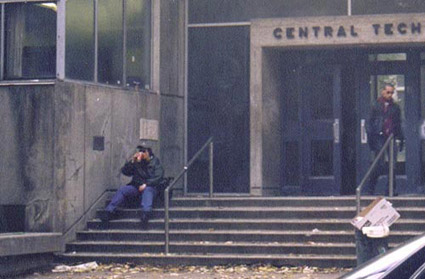 This 7-channel video entitled Hiccup is based on a 30 day performance that took place daily between 8:45 am & 9:00 am at Central Tech High School in downtown Toronto. Conceived as an orchestrated "ballet of the ordinary", the work pivots on the play of two differentiated timelines: my standardized routine of carefully choreographed body movements, juxtaposed against the limitless variables of the everyday world.